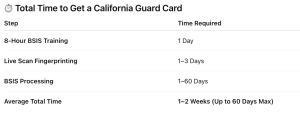 Most students who train through National IPS receive their Guard Card in about 1–2 weeks, but the official processing window from BSIS can extend up to 60 days.